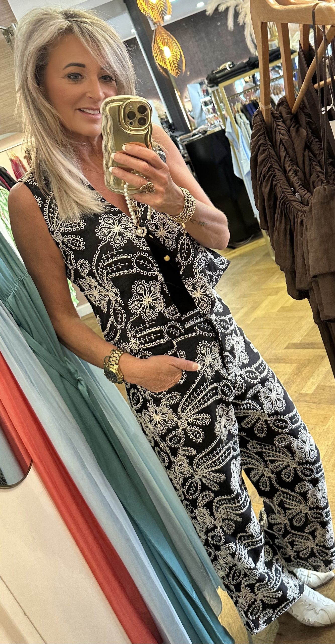 De broek sluit dmv een knoop en heeft elastiek in de rug en lusjes voor eventueel een riem.
