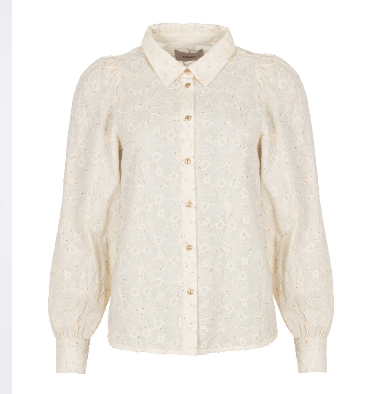 Voeg een vleugje verfijning toe aan je garderobe met deze prachtige blouse van Freebird in een luchtige woven katoenen kwaliteit. Het ontwerp is rijkelijk voorzien van broderie details en subtiele kleine pailletjes, die een elegante glans creëren bij elke beweging.De vrouwelijke pasvorm en de zachte off-white kleur maken deze blouse ideaal voor zowel casual looks als feestelijke gelegenheden. Een tijdloos item dat moeiteloos charme en stijl combineert.