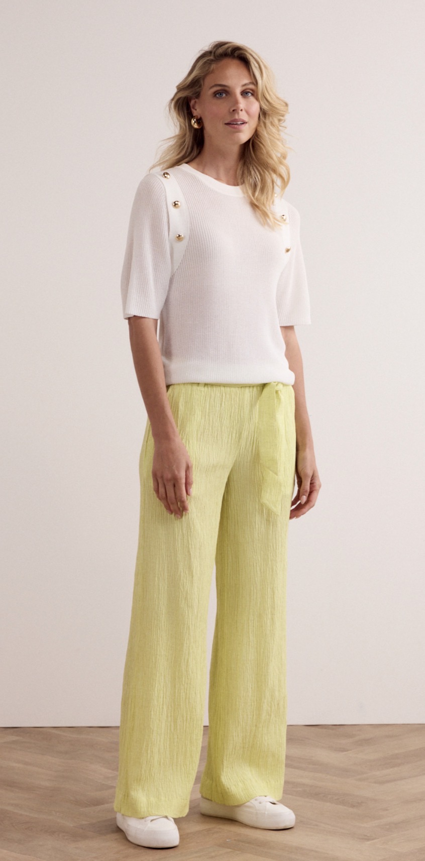 De Creased Wide-Leg Trousers van Tramontana is een elegante en luchtige broek met een moderne, ontspannen uitstraling en een verfijnd silhouet. Deze trousers is vervaardigd uit een rijke en ademende stofmix van 64% viscose, 12% polyamide, 10% linnen, 8% bamboe, 5% lyocell en 1% elastaan, wat zorgt voor een comfortabel draaggevoel, een natuurlijke textuur en een mooie, soepele valling. De subtiele crinkle-structuur geeft de broek een nonchalante luxe uitstraling, terwijl de wijde pijpen zorgen voor een verlengend en flatterend effect. De taille is comfortabel afgewerkt en sluit mooi aan zonder in te leveren op bewegingsvrijheid. Uitgevoerd in de frisse, zomerse kleur Celery is deze trousers perfect voor zowel casual als geklede looks. Combineer de Creased Wide-Leg Trousers met een fijngebreide top of blouse voor een elegante outfit, of draag met een T-shirt en sneakers voor een moderne, relaxte stijl. Een veelzijdige statement broek die comfort, natuurlijke elegantie en eigentijdse flair moeiteloos samenbrengt.