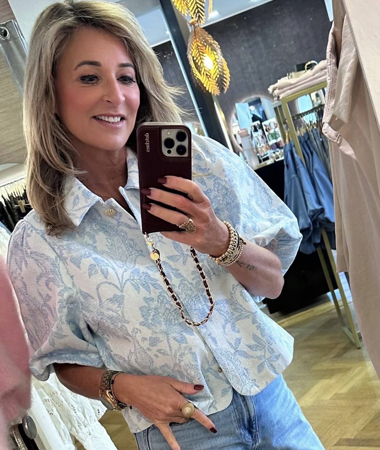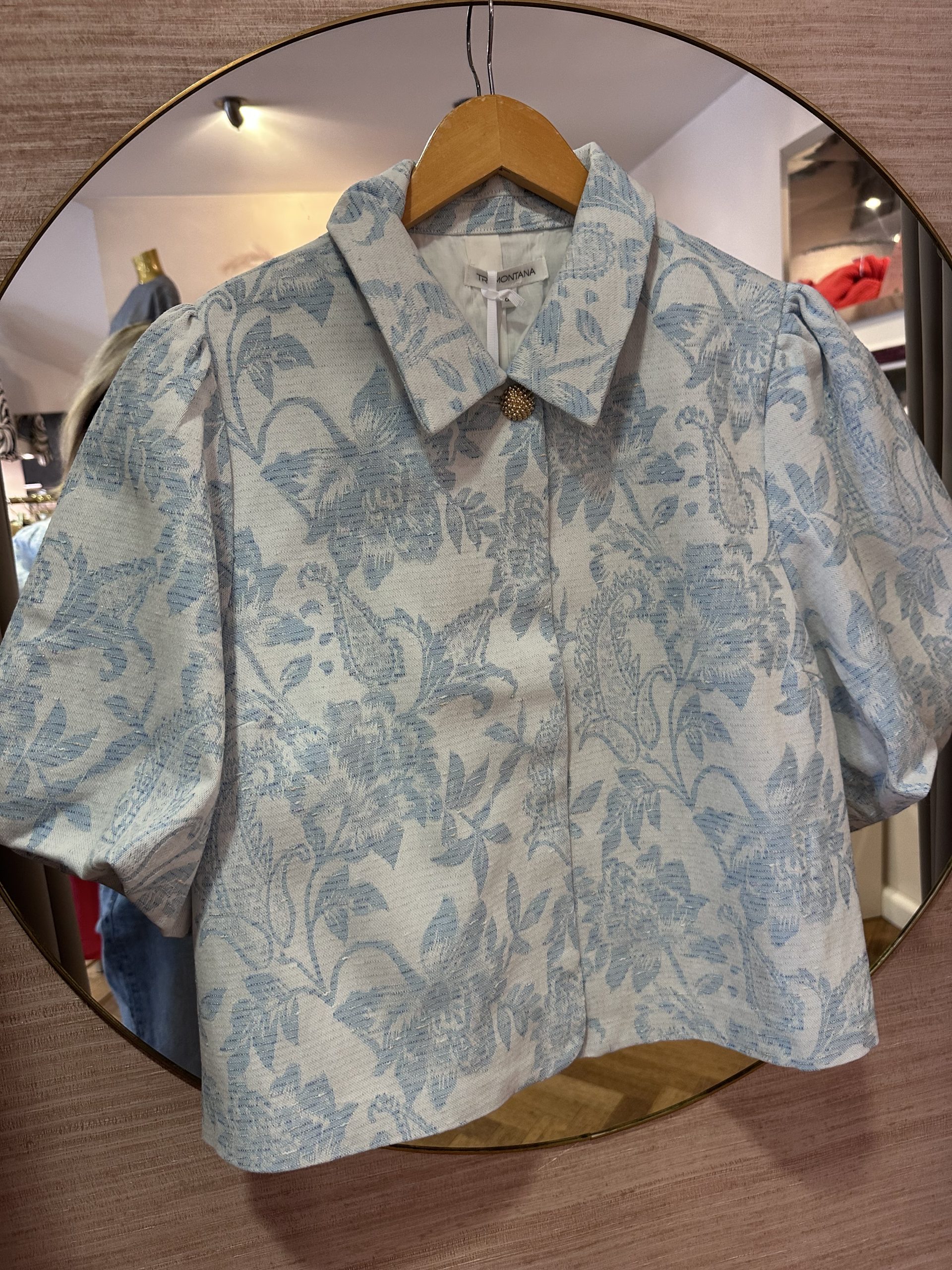Het verfijnde jacquard dessin in de kleur Light Blue Denim geeft het ontwerp een elegante diepte en een stijlvolle twist op klassiek denim. De korte mouwen en licht getailleerde pasvorm zorgen voor een moderne, luchtige look, terwijl de klassieke kraag en decoratieve knoopsluiting aan de voorzijde het geheel een chic accent geven. Draag de Denim Jacquard Jacket over een top of blouse met een jeans voor een frisse, casual-chique uitstraling, of combineer met een pantalon of rok voor een meer geklede look. Een stijlvolle jacket die moeiteloos comfort, vrouwelijkheid en verfijning samenbrengt.