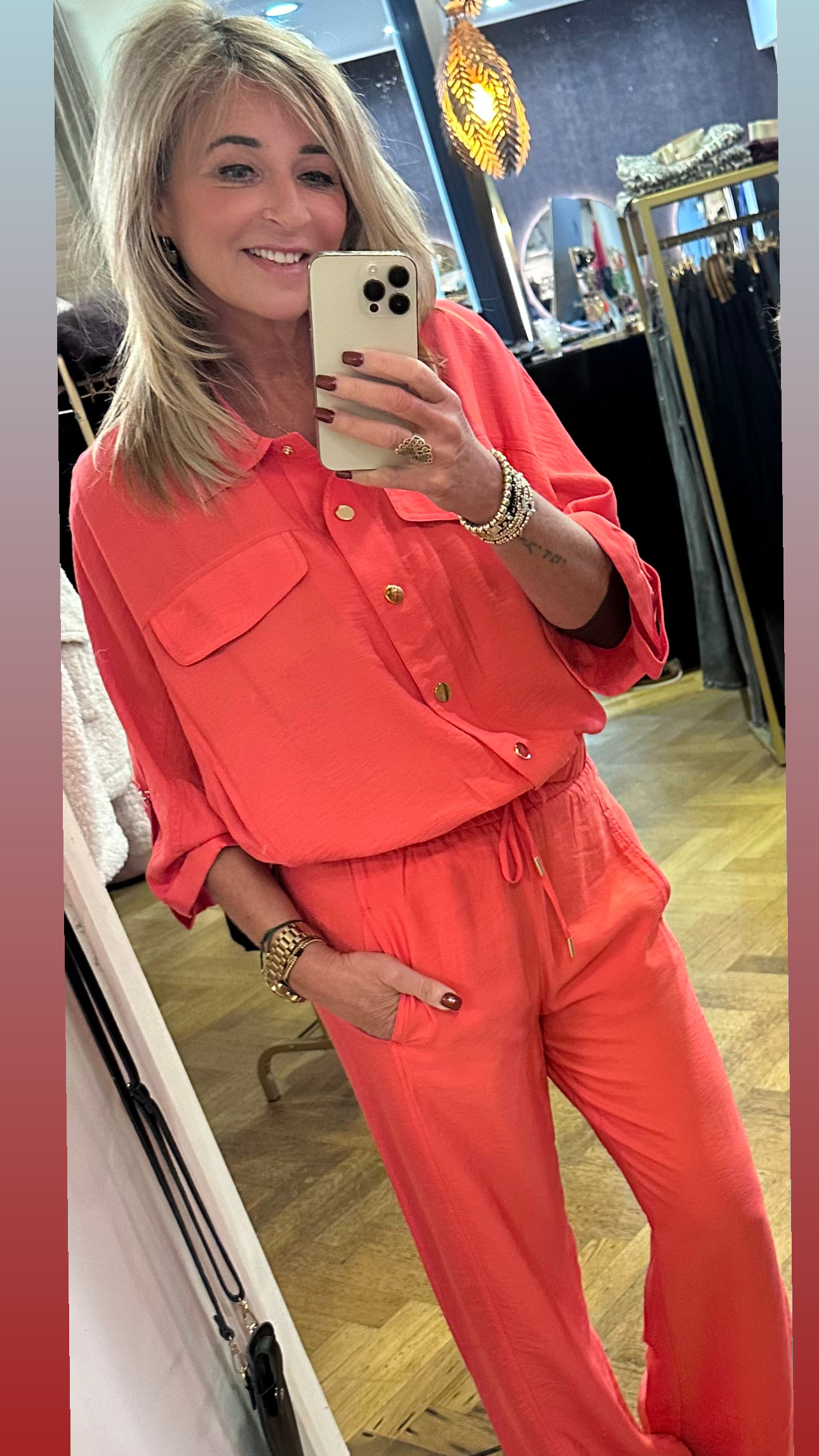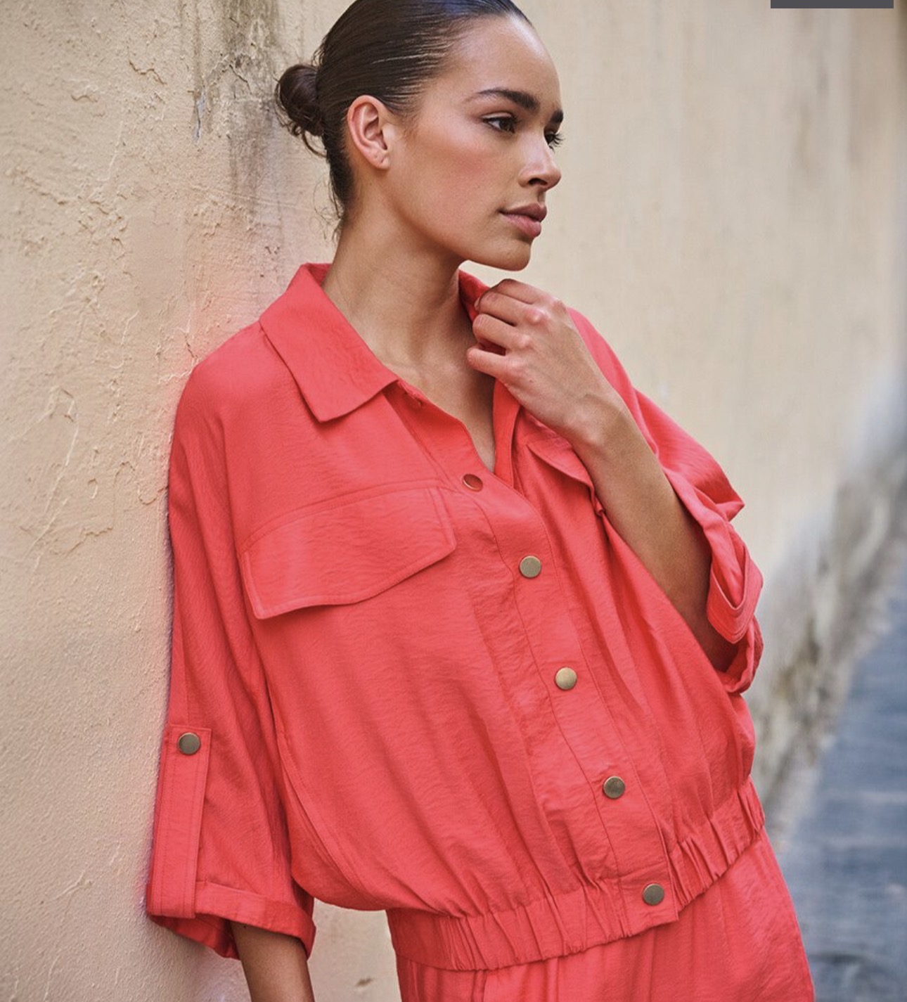 Het jasje is in de kleur Chili Red en is gemaakt van 75% tencel, 13% nylon en 12% polyester.