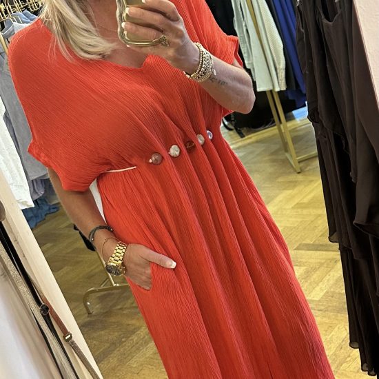 Er zit een subtiele lichte glans over de en de jurk heeft een split vooraan en 2 steekzakjes