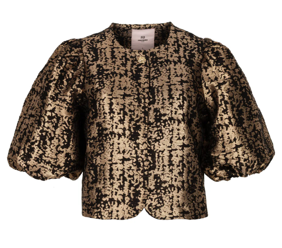 Het jasje is gemaakt van een rijke woven jacquard kwaliteit met een subtiele metallic glans die zorgt voor een chique en moderne look. De korte ballonmouwen voegen een speels en vrouwelijk accent toe, terwijl de rechte pasvorm zorgt voor een tijdloze balans. Perfect om je outfit een stijlvolle upgrade te geven – of je het nu combineert met een jurk of een pantalon.