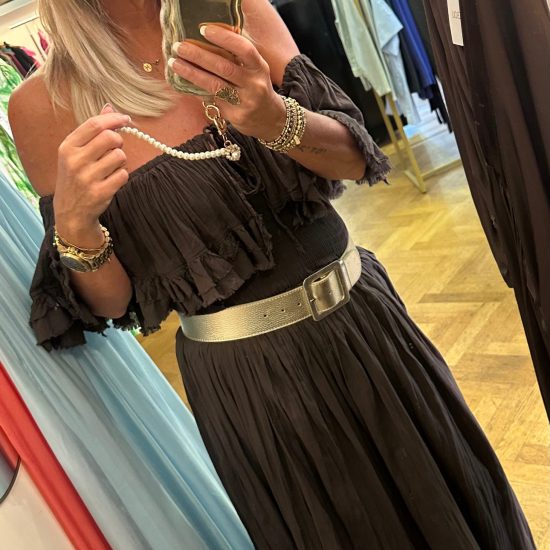 Je kan hem off shoulder dragen maar ook gewoon op de schouders laten hangen.